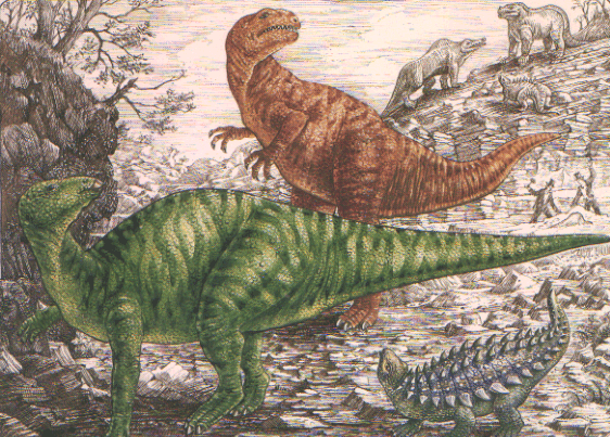 Richard Owen's Dinosauria (1841): Iguanodon, Megalosaurus and Hylaeosurus emerging from the Dinosaur Quarry in Cuckfield, Sussex, with Owen's original restorations on the hillside